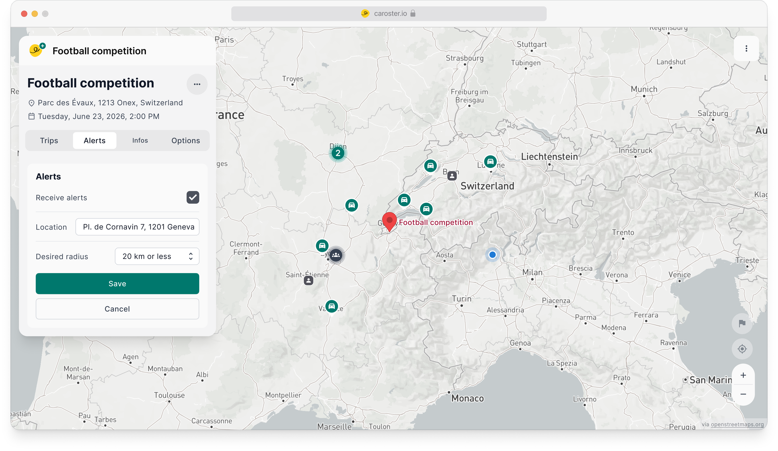 Add an alert with the desired meeting place and proximity radius. Receive notification when a matching trip is added.